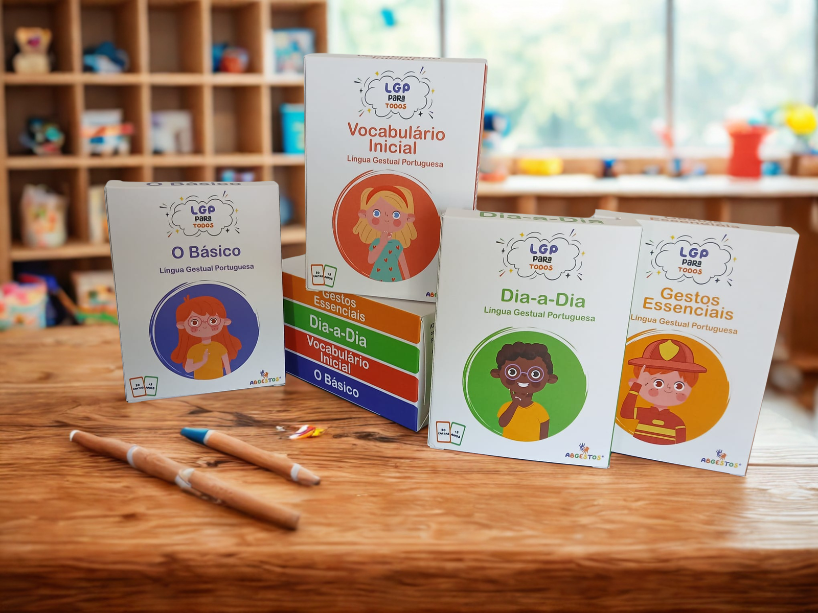 Resistentes, coloridas e fáceis de transportar, são ideais para aprender gestos e vocabulário em casa, na escola ou em família.